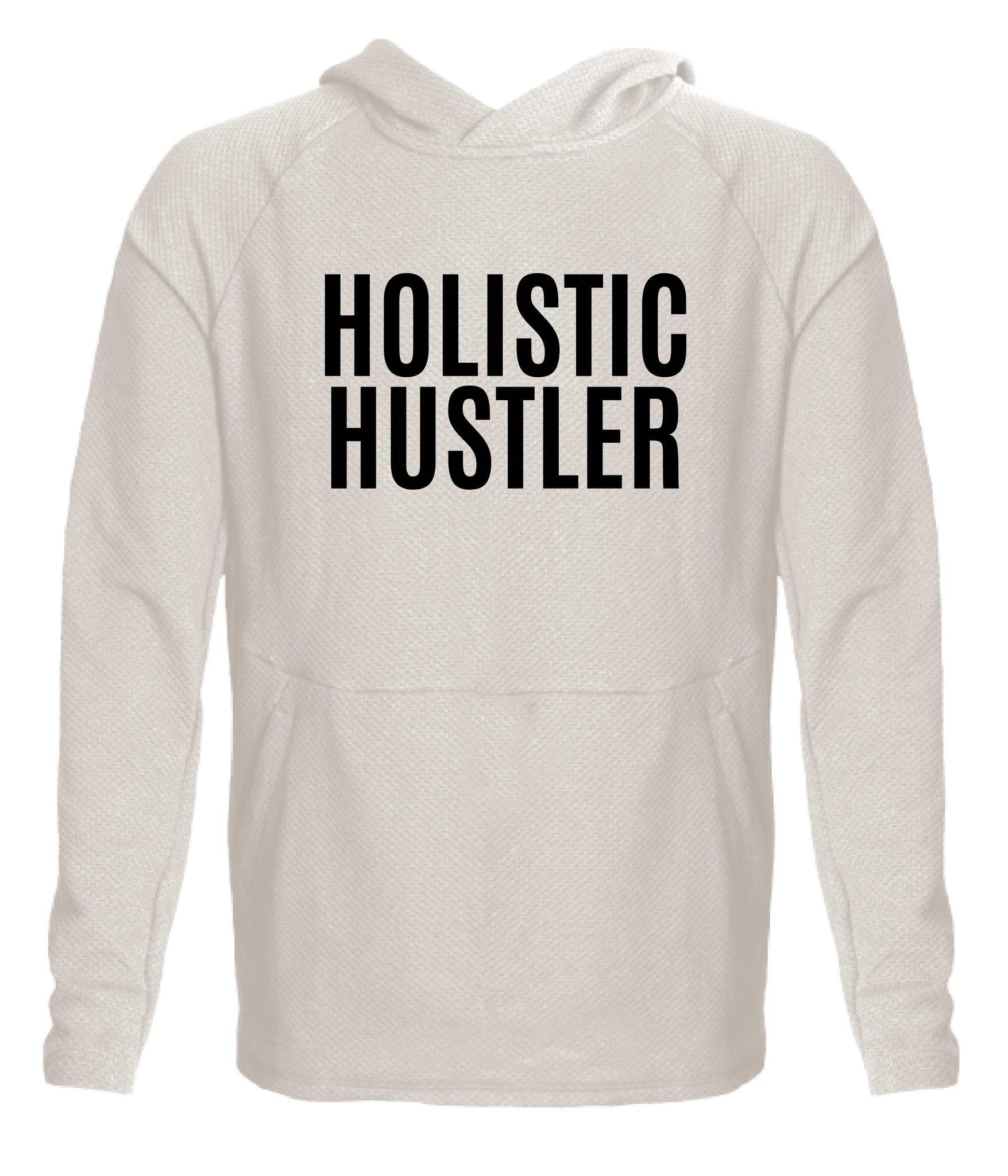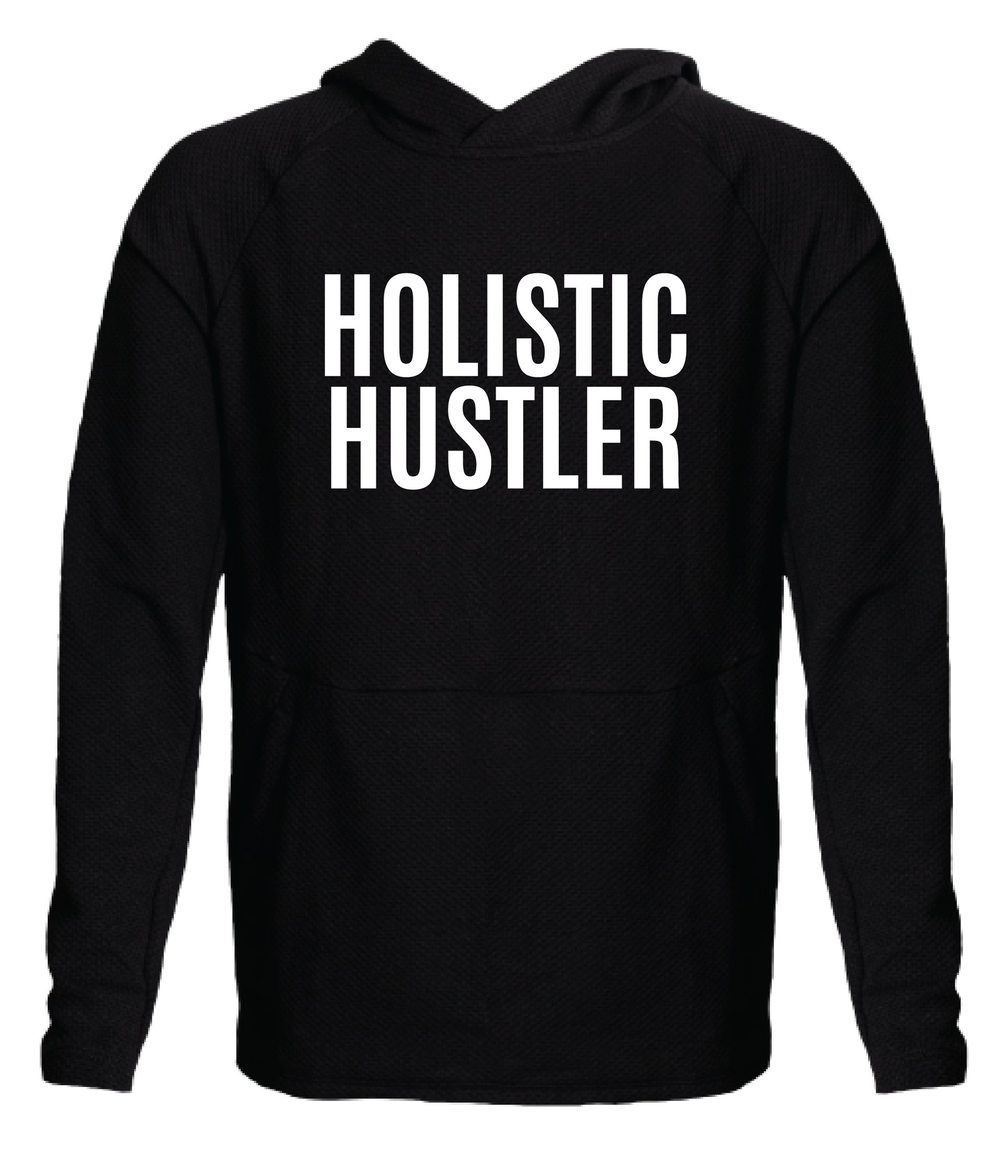 Fitted hood with adjustable drawstring + large front pocket for storage